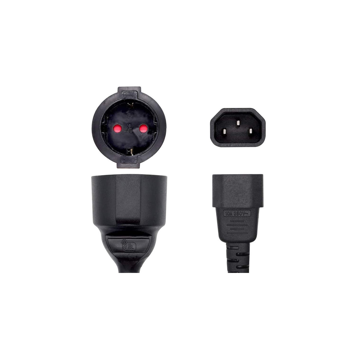 Tipo de conector: Uma extremidade do cabo terá um plugue macho C14, que se conecta ao conector de entrada C14 no dispositivo elétrico. A outra extremidade do cabo terá um plugue Schuko fêmea, que se conecta à tomada Schuko na parede.